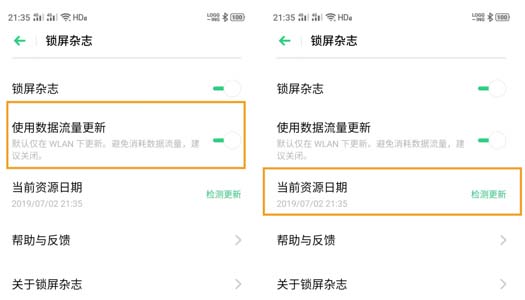 3、锁屏杂志默认是在WLAN网络下进行更新的,当然小伙伴也可以选择将【使用数据流量更新】打开,或者选择手动【检测更新】。