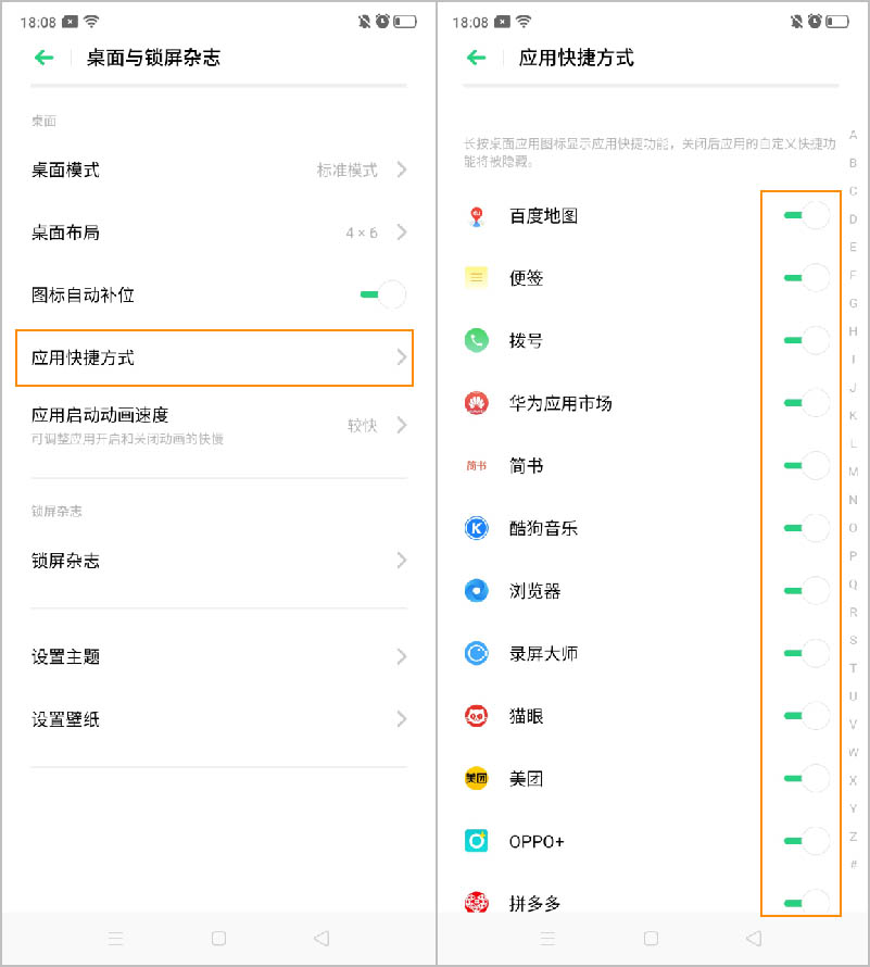 2、应用快捷方式、一般这个功能都是默认开启的。
