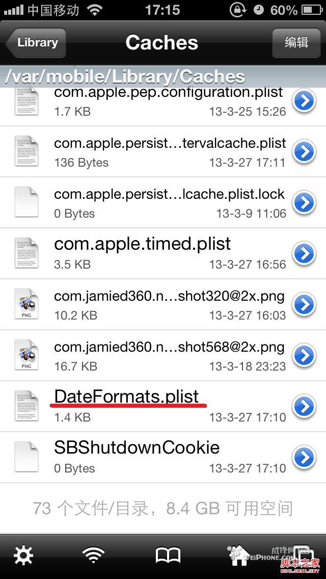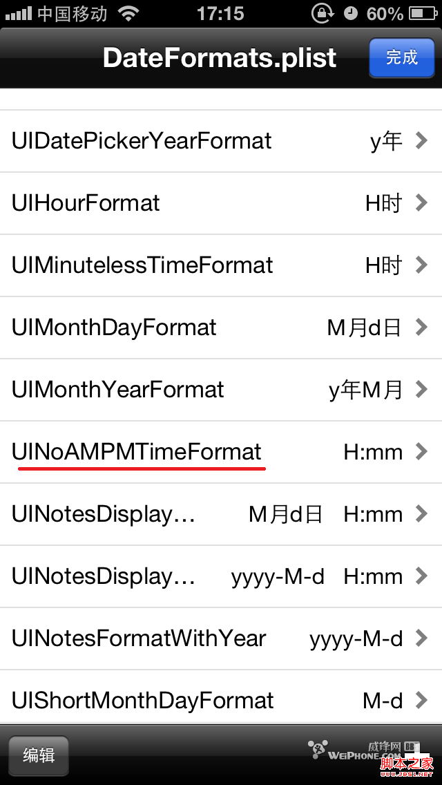 1. 用iFile打开var/mobile/library/caches/,找到DateFormats.plist,用属性编辑器打开。本文所做的修改都是针对这个文件。