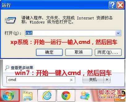 1)xp系统:开始—运行—输入cmd,然后回车 win7系统:开始—键入cmd,回车