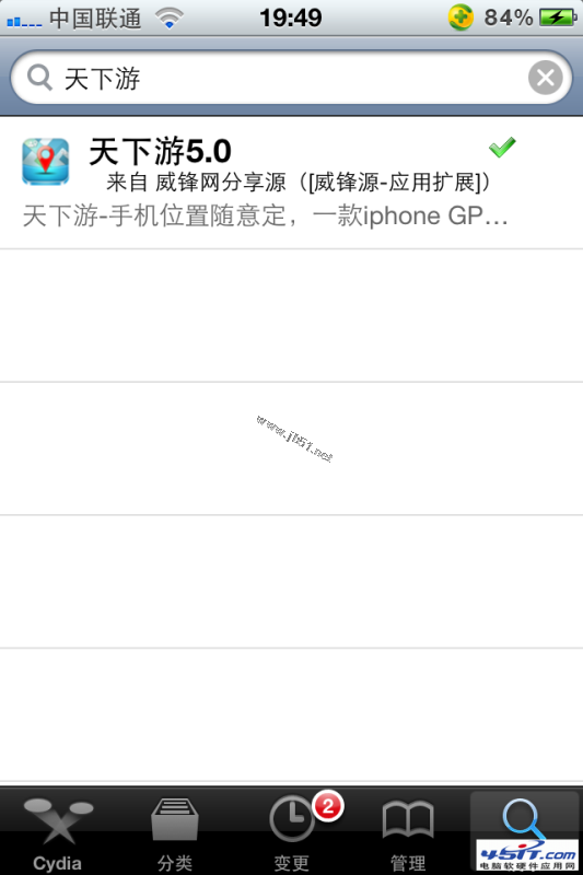 在此就不多废话了,直接进入主题。首先是要越狱的机子,在Cydia里安装“天下游” 这款插件