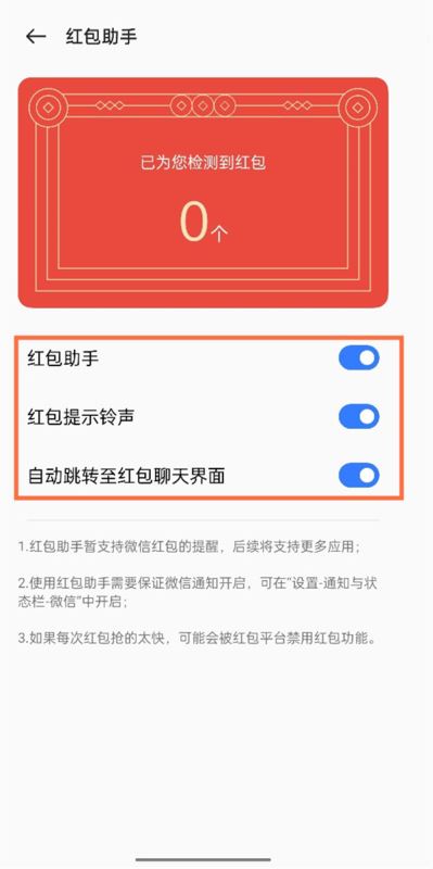 最后在红包助手页面,将全部功能开启即可。