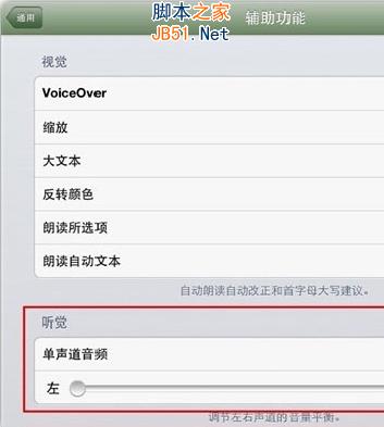 3.在辅助功能界面的听觉版块,默认的滑块是在中间显示的,如果你的耳机右侧没有的声音,就将滑块拖拽到最左侧;左侧的坏了就移动到右侧。
