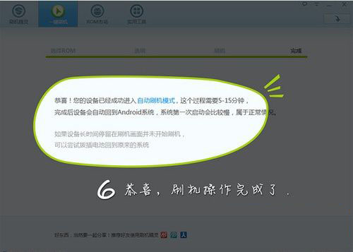 6)接下来手机会进入自动刷机模式,需要5-15分钟的时候,刷机完成后会提示成功的。手机会自动重启,重启的时候需要花费一些时间,我们耐心等候,直到手机重启完成就可以使用你的手机了。