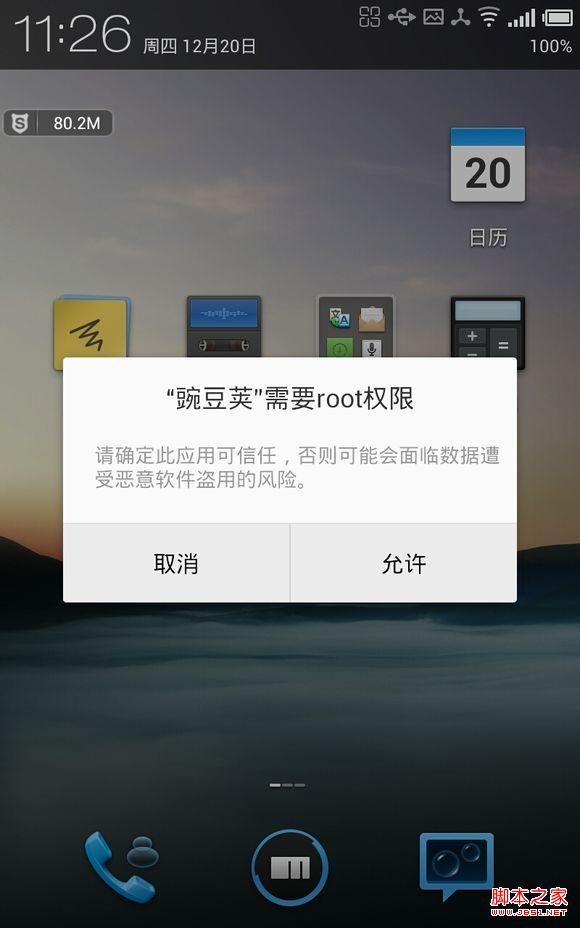 ↑用电脑打开豌豆夹确认连接上手机 然后依上图序号 1.先打开应用和游戏 2.点击系统 把你认为不需要的ROOT掉(我的建议 play商店 google talk 新闻和天气 [应用中心 便签用的上就要 反之root] 如果不想变砖别的程序不要动) 3.卸载 手机屏幕出现需要ROOT权限如下图↓ 点允许(一般出现3次) 卸载成功