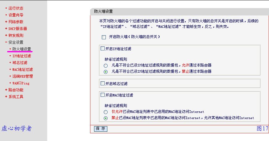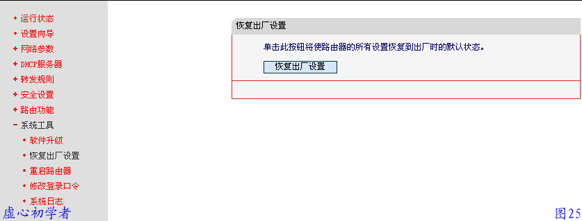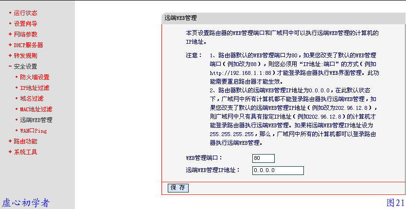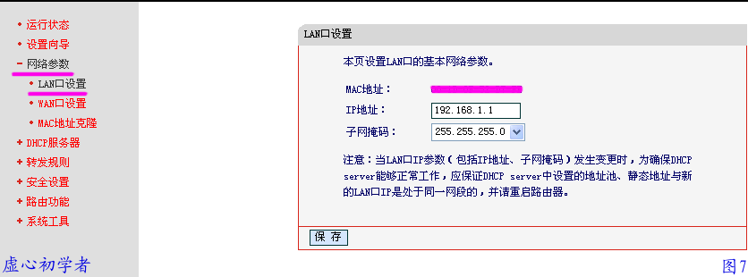 第七步:MAC地址是本路由器对局域网的MAC地址,此值不可更改。IP地址是本路由器对局域网的IP地址,局域网中所有计算机的默认网关必须设置为该IP地址。需要注意的是如果改变了LAN口的IP地址,必须用新的IP地址才能登录本路由器进行WEB界面管理。而且如果你所设置的新的LAN口IP地址与原来的LAN口IP地址不在同一网段的话,本路由器的虚拟服务器和DMZ主机功能将失效。如果希望启用这些功能,要重新对其进行设置。子网掩码是本路由器对局域网的子网掩码,一般为255.255.255.0,局域网中所有计算机的子网掩码必须与此处设置相同。