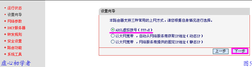 第五步:WAN口连接类型是指本路由器支持三种常用的上网方式,请您根据自身情况进行选择。如果您的上网方式为动态 IP,即您可以自动从网络服务商(例如:中国电信)获取IP地址,请选择“动态IP”;如果您的上网方式为静态IP,即您拥有网络服务商(例如:中国电信)提供的固定IP地址,请选择“静态IP”;如果您上网的方式为ADSL虚拟拨号方式,请选择“PPPoE”。