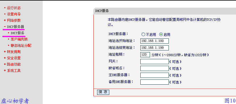 第十步:TCP/IP协议设置包括IP地址、子网掩码、网关、以及DNS服务器等。为局域网中所有的计算机正确配置 TCP/IP协议并不是一件容易的事,幸运的是,DHCP服务器提供了这种功能。如果使用本路由器的DHCP服务器功能的话,您可以让DHCP服务器自动替您配置局域网中各计算机的TCP/IP协议。选择“DHCP服务器”就可以对路由器的的DHCP服务器功能进行设置。地址池开始地址是指DHCP服务器所自动分配的IP的起始地址。如上图中的开始地址为192.168.1.101。地址池结束地址是指DHCP服务器所自动分配的IP的结束地址,上图中为 192.168.1.199了。网关是可选的建议填入路由器LAN口的IP地址,缺省是192.168.1.1。主DNS服务器也是可选的填入ISP提供给您的DNS服务器,不清楚可以向ISP询问其他的选项就不用填写了。为了使用本路由器的DHCP服务器功能,局域网中各计算机的TCP/IP协议必须设置为“自动获得IP地址”。此功能需要重启路由器才能生效。