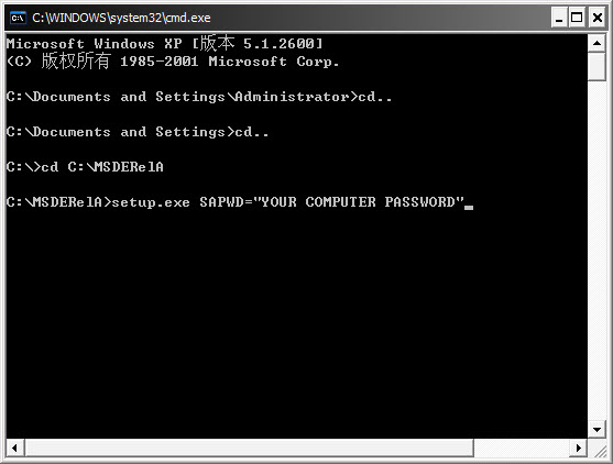 命令提示符下进入安装目录。比如MSDERelA。然后键入setup.exe SAPWD="YOUR COMPUTER PASSWORD".安装成功了。如图示: