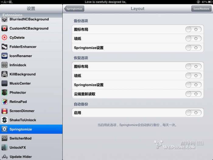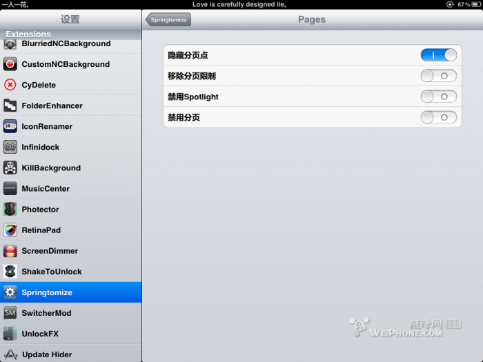 这里的功能就多了,可以调整图标的大小以及后台图标的大小,就介绍下,截图里没有截到的几个功能,那就是隐藏报刊杂志应用,以及hide springtomize 启用按钮,可以自定义选择需要隐藏的程序图标