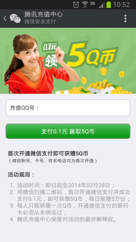 最近腾讯微信出现了一个2014腾讯微信送5q币活动。用微信扫一扫二维码就可以0.1元获取5Q币了,是不是很赚?今天就为大家分享一个微信小技巧,免费得Q币