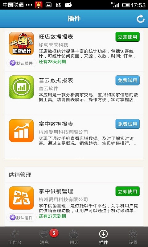 4.插件中心:商品管理、交易管理、数据统计等常用功能,均有多款插件供选择,分销商卖家可订购使用供销管理插件