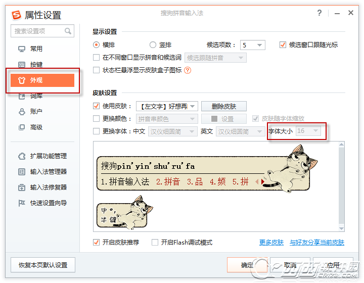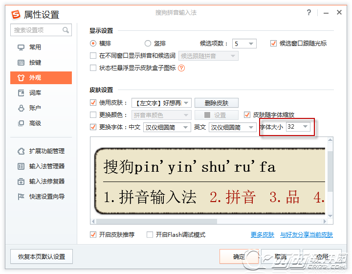 3、右边皮肤设置第三行,更换字体,目前这个版本最大的字体是32,我们选择它,是不是区别就很大了。