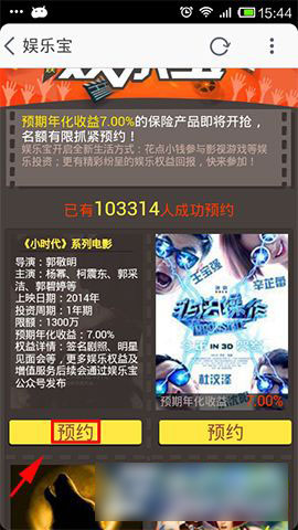 1)首先打开手机淘宝,在首页滚播屏第一个就是娱乐宝,点击进入。首批登陆娱乐宝的投资项目分别为:郭敬明导演的《小时代3》《小时代4》;冯绍峰、窦骁等人主演的电影《狼图腾》;孙周导演的《非法操作》;全球首款明星主题的大型社交游戏《魔范学院》,可以点击你要预约购买的电影的图片(如小编选择提小时代电影);(如下图所示)
