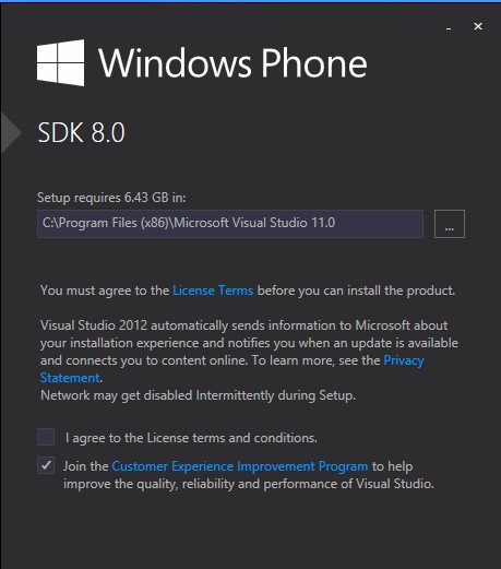在官方下载页面下载SDK后安装,因为我下载的是iso版本,该版本貌似md5校验码有问题,所以在安装完后会提示“Visual C++ 2012 x64 Debug Runtime 无法找到元素”。不过不影响我开发Windows Phone App,也就没去细究。