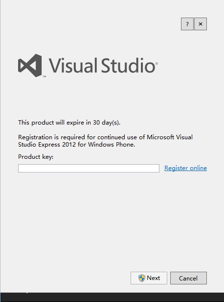 在运行Visual Studio Express 2012 For Windows Phone的时候,会要求输入序列号,这个只需要点击旁边的“在线注册”字样注册就可以收到带有序列号的邮件。