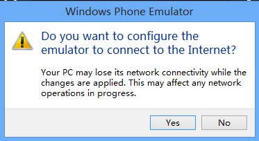保存后,重新打开虚拟机。这次运行项目时,会提示“Do you want to configure the emulator to connect to the Internet?”,意思就是网络连接丢失,我们选择“Yes”,让模拟器配置网络连接。