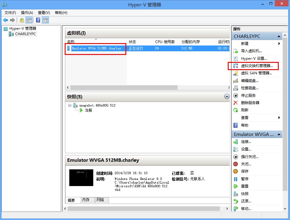 如果发些自己还是启动不了模拟器,请检查下自己的Hyper-V交换机是否已经建立。交换机配置中至少包含“Windows Phone Emulator Internal Switch”这个交换机。