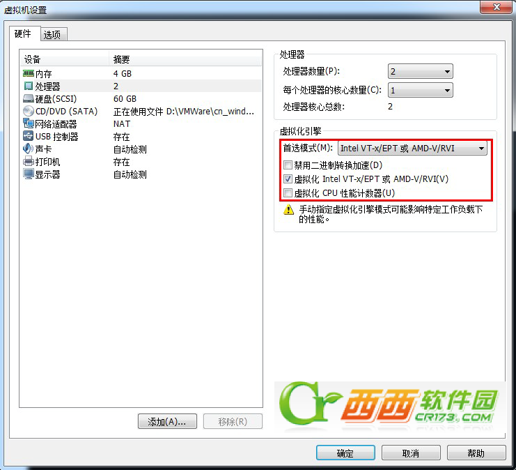 在启动虚拟机前,设置CPU的虚拟化引擎为 “Intel VT-x/EPT 或 AMD-V/RVI”,同时让CD/DVD指向Windows 8 专业版或更高版的iso文件。