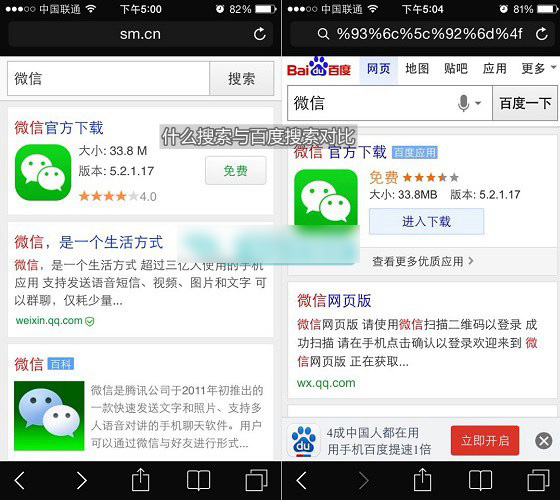 UC神马搜索与百度搜索“微信”结果对比