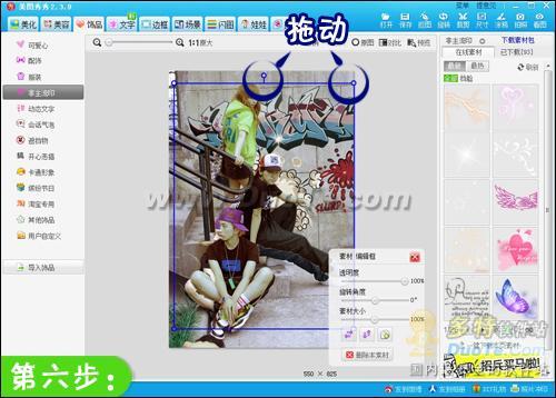 4.现在选择“饰品”界面里的“非主流印”功能,在右侧挑选喜欢的涂鸦饰品,并用编辑框调节适当的饰品透明度、大小和位置即可