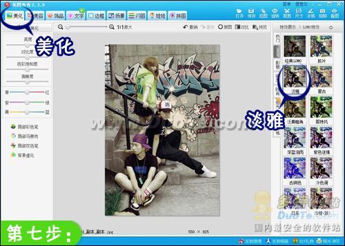 7.最后选择“美化”菜单,在右侧为照片添加一个喜欢的特效,不仅可以让照片的色泽更好看也能让涂鸦效果更贴合、逼真,我选择的是LOMO——淡雅特效。
