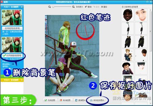 3.现在选择“删除背景笔”,用红色笔迹涂抹不需要的部分。完成后点击“保存抠好图片”,将图片保存一下,最后关掉现在的界面,回到图片原状