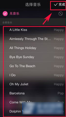 2)进入后,大家就能看到有很多美拍自带的背景音乐,可以选择你可以你喜欢的进入选择,然后点击【完成】,到这,背景音乐就已经添加完成了。(如下图所示)