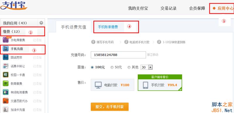1、登录支付宝——【应用中心】——【手机充值】——【手机账单缴费】——【缴费首页】;