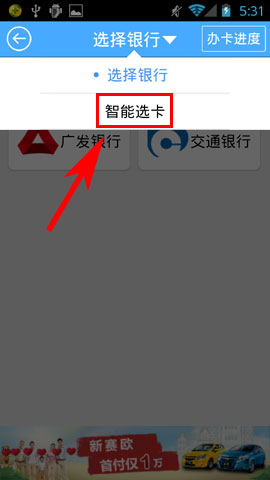 1)点击打开办卡神器,点击屏幕上方【选择银行】(如下图所示)