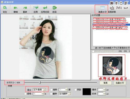 选择混合——正片叠底。这个选项非常重要,它能够让水印图片“融”入背景图片,产生一体的感觉,连衣服上有褶皱的地方,融入后还是会有褶皱。