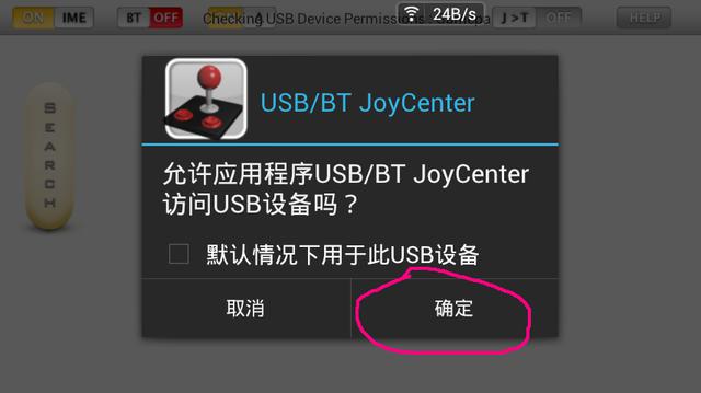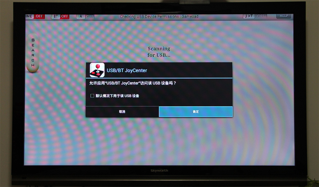 1、在乐视盒子上安装好这个程序后,击左侧的“搜索设备”,在弹出的提示框上点确定(注意不要勾选“默认情况下用于该USB设备”的复选框),之后应用就会识别出连接至手机的游戏手柄,如图: