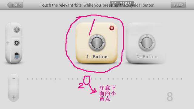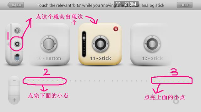 点击一下图中左上添加按键的按钮就会添加一个按钮,在屏幕中间会显示出来,这样你的手柄上有几个按键你就添加几个按钮。添加完按钮后,用鼠标点击第1个按钮,这时我们先按手柄上的1键,看下下面哪个点有反应,看到有反应的点之后,我们按住手柄上的1键,再鼠标点那个有反应的点(注意上下的小点分开来,不要点两个或两个以上),点了之后会有点微黄的感觉,这时松开手柄上的1键,这时我们刚刚点的那个小点就会变成黄色的小点,如图: