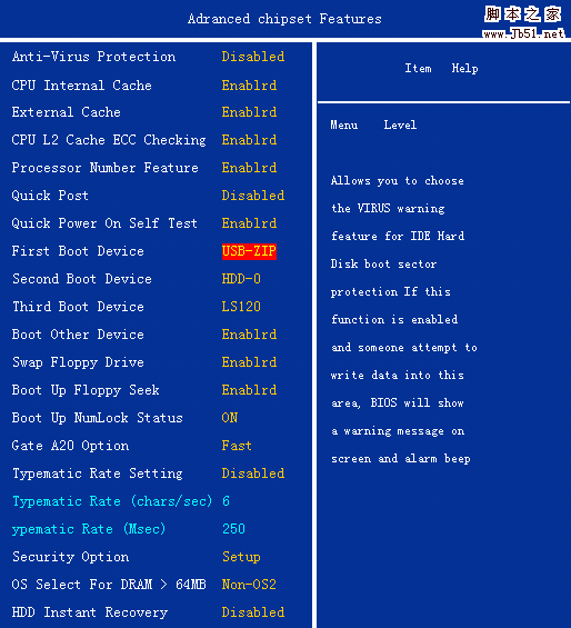(2)用“↓”移动光标到“First Boot Device”,用“PageDown”键选择为“USB-ZIP”.