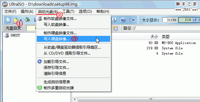(2).运行UltraISO v9.2(如图),打开setup98.img(仅含DOS内核)① -〉启动光盘② -> 写入硬盘映像③