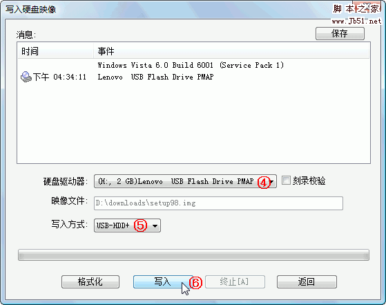 -> 硬盘驱动器选择联想2G奥运U盘④ -> 写入方式使用默认的USB-HDD+(兼容ZIP)⑤ -> 写入⑥.