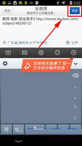 3)输入信息后,点击【发送】即可,在简介界面左上角可见微博发送成功提示。(如下图)