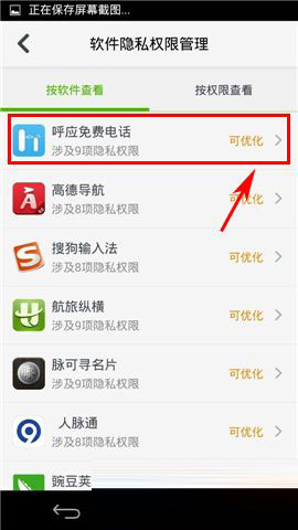 3)回到【软件隐私权限管理】,点击【按权限查看】栏,可以按权限查看,在里面,也同样可以禁止或允许某一软件的该全权限。(如下图)