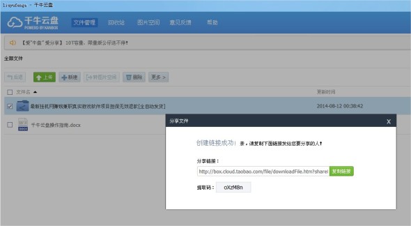 千牛网盘对于我们这些卖虚拟货品的卖家来说会给于我们最大的帮助,我们再也不用但心我们所卖的虚拟货品的链接会失效了。