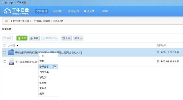 亲们,千牛网盘现以支持分享公开文件夹了,只需轻轻松松的以下三步操作,你就可以把你的重要的文件分享给你的好友,家人,同事,亲戚...