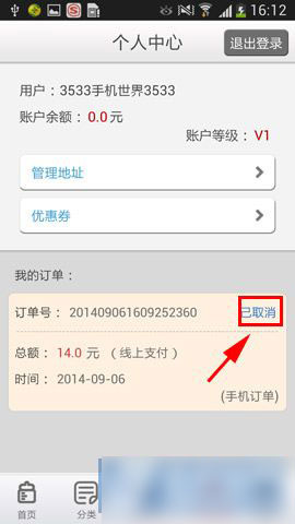 2)下拉并点击【取消订单】;返回个人中心即可看到订单已取消。(如下图)