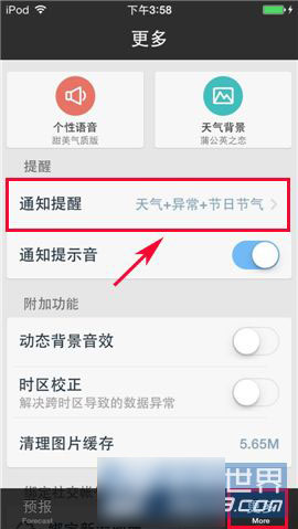 1)首先打开天气通,点击【更多】,点击【通知提醒】进入,可以选择第一次提醒时间和第二次提醒时间点击一下(例:第一次提醒时间),会弹出窗口上下拉动选择时间。(如下图)