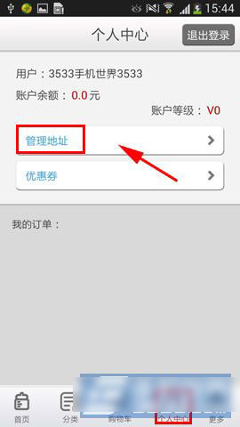1)安装并打开麦乐购;点击【个人中心】选择【管理地址】。(如下图)