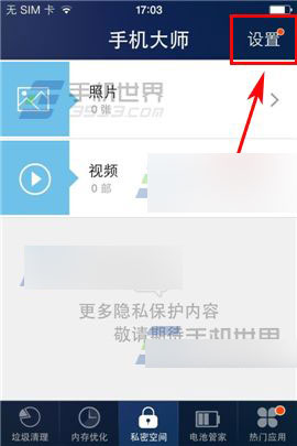 1)下载并打开【手机大师】,进入首页后点击下方【私密空间】,点击右上角【设置】。(如下图)