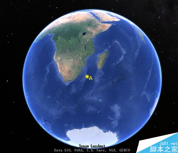 如图,在Google Earth软件中把地球旋转到这个角度,标出A点。直接在软件下边栏可以查到这一点的经纬坐标:大约在南纬30°,东经37°左右。