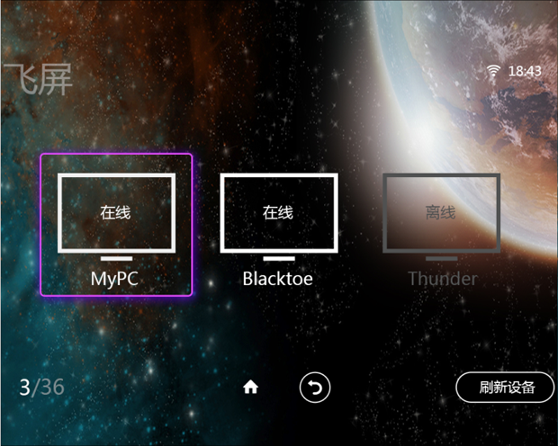3、打开魔镜APP,找到飞屏功能。进入后飞屏会自动搜索可连接的电脑并列出。点击“刷新设备”可重新搜索。