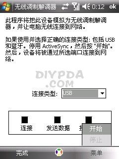 1、点击手机上的开始-程序-网络-无线调制解调器,连接类型选USB,然后点右下角的菜单,点击开始