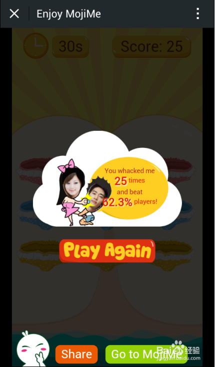 10、30秒时间结束后,将会显示一个打中率和比分的情况。点击share按钮即可退出游戏页面。