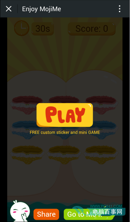 微信MojiMe是一款基于手机平台运行的软件,目前只有安卓版本,大家可以进入各大应用商店搜索下载,当然也可以百度搜索进入官网下载。下载安装后,运行MojiMe。用自己喜欢的照片自定义制作出动态表情,将自己制作好的MojiMe表情分享到朋友圈后,MojiMe将会生成一个游戏链接,类似于打地鼠的游戏,本人或自己的好友在朋友圈中点击MojiMe链接后,将会生成一个新的MojiMe游戏页面,在规定的30秒钟内,用手指打中冒出来的表情即为算数,如下图所示: