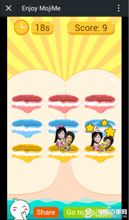 7、此时会看到MojiMe 游戏界面上一共有九个洞洞、自己制作的头像表情会随机从某一个洞洞跳出来。如下图所示: